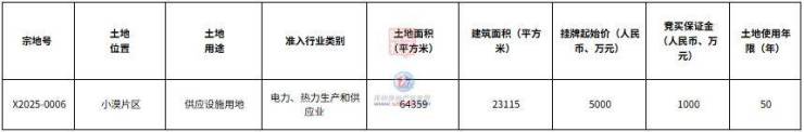 该地宗地号X2025-0006,土地位置小漠片区,土地用途供应设施用地,准入行业类别电力、热力生产和供应业,土地面积64359平方米,建筑面积23115平方米,挂牌起始价5000万元,土地使用年限50年。