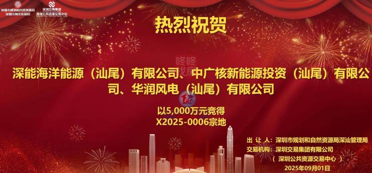 9月1日,深能海洋、中广核新能源、华润风电三家以底价5000万联合拿下深汕合作区供应设施用地。