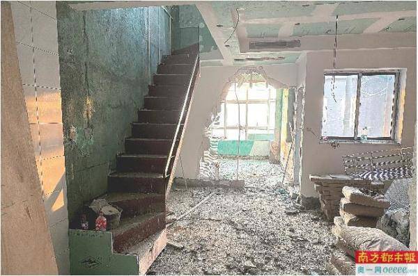 违建单位位于电梯厅外围,经门口工作人员简单询问后,湾财社记者被发放了一顶安全帽,得以进入到其中一间违建房内。据观察,该违建房为复式结构,楼梯位于左侧,正对门口的一堵墙已被砸开,地面还堆放着许多物料。由于现场人员众多,且多处结构已被破坏,出于安全考虑,湾财社记者未能进到二楼参观。