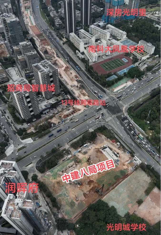 中建八局A503-0107宗地位于光明区凤凰街道,处于光侨路与观光路交汇出东南侧,与南方科技大学附属光明凤凰学校、在建的13号线二期北延同观路站一路之隔。