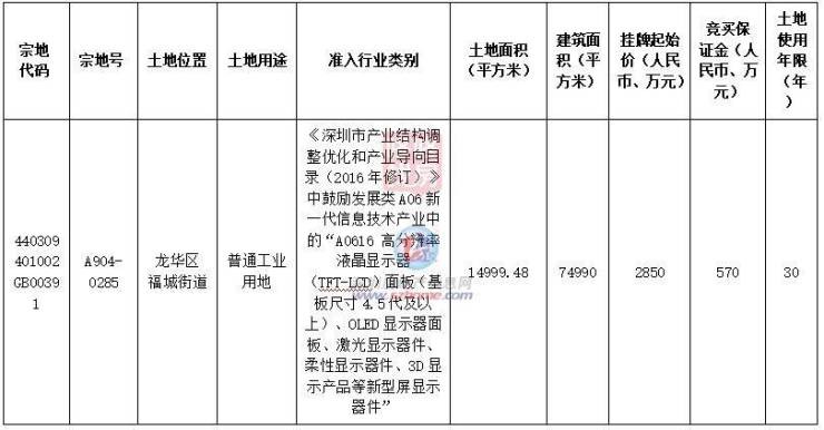 该地块准入行业为《深圳市产业结构调整优化和产业导向目录(2016年修订)》中鼓励发展类A06新一代信息技术产业中的“A0616 高分辨率液晶显示器(TFT-LCD)面板(基板尺寸4.5代及以上)、OLED显示器面板、激光显示器件、柔性显示器件、3D显示产品等新型屏显示器件”。