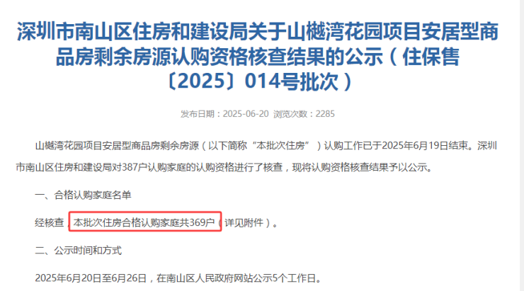 日前,南山住建局公示山樾湾〔2025〕014号批次配售审查结果,本批共有387户家庭认购,最终369户家庭合格入围。