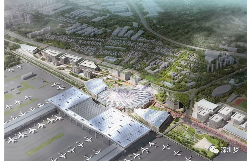 枢纽片区建筑概念设计:设计范围为航站六路、宝安大道、兴华路所围合的区域,面积约67.7公顷。