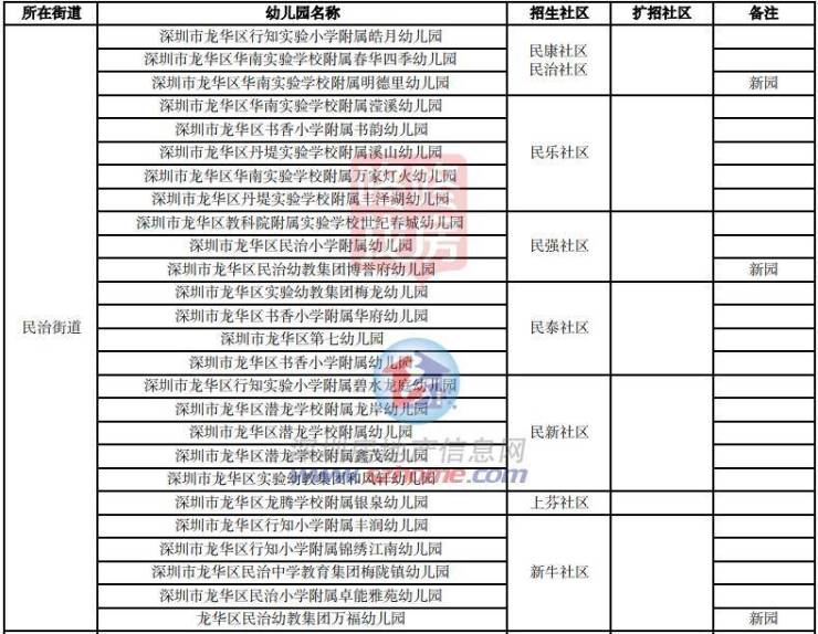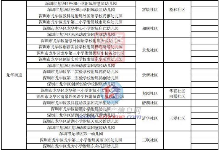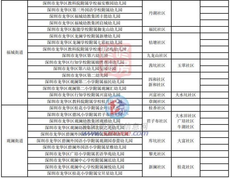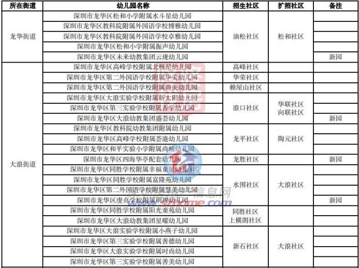 玉龙学校附属龙悦居幼儿园、玉龙学校附属幼儿园、深外龙学校附属圣华幼儿园、深外龙学校附属幼儿园、红山幼教集团附属幼儿园、学仕里配套幼儿园扩招,扩招范围:樟坑社区。