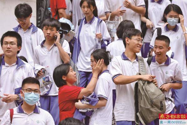 6月7日,高考首日最后一门数学考试结束,广州市第十六中学考点考生陆续走出。不少考生与老师有说有笑,也有老师在安慰情绪低落的考生。 南都记者 黎湛均 摄