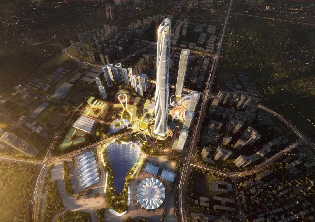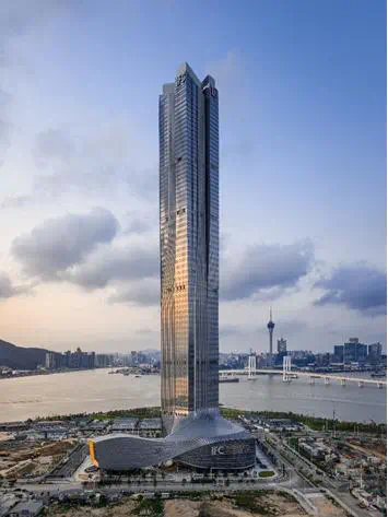由Aedas设计的珠海横琴国际金融中心,摄影:CreatAR ImagesQ:包括珠海排名前列高楼IFC等摩天大楼,在整体设计和施工方面如何兼顾安全和美观?A: 建筑不只是自由的艺术表达,更应是现实中可落地的方案。由于深圳、珠海等南方沿海城市有较长的台风季,建筑通常采用流线造型,以降低塔楼风荷载,并精心考量建筑坐向和裙房开口朝向,有效降低风阻,减少阵风,提高行人区的舒适性,并确保安全无忧。为更好地呈现塔楼向裙楼的自然过渡,有的设计还将体量沿中心轴和水平轴空间扭转,使裙楼的屋顶得以延展升腾为塔楼外墙,从而将高耸窄长的塔楼与相对宽阔低矮的裙楼优质结合,线条灵动优雅。在裙楼和塔楼的转换区,通过调整百叶固定件的角度变化,在不产生曲面百叶的前提下实现立面线条的自然流转;裙楼的线条通过合理化拆分的方式,以一段段直线百叶趋近扭曲百叶。最终以平板玻璃为主搭配少量单曲面玻璃优质呈现了3D曲线,在高精度实现设计的同时,较大程度降低建造难度兼顾安全和美观。