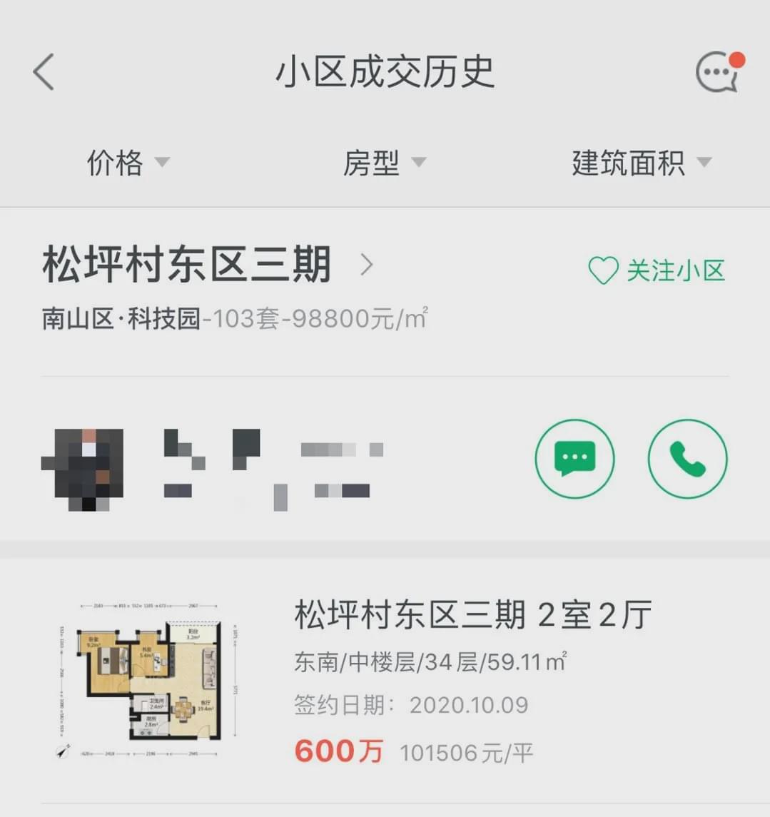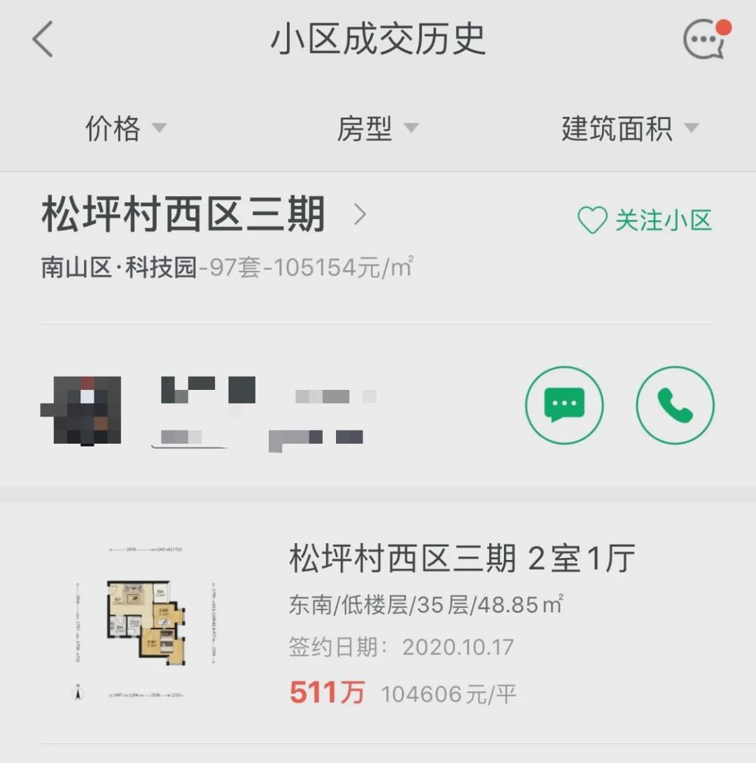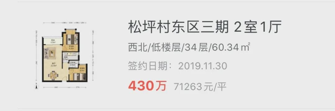 再看一个案例:去年11月30日,松坪村三期东区,一套60㎡2房成交总价430万,单价7.1万/㎡。而今年10月9日,同样是约60㎡2房,成交总价已达600万,单价10.2万/㎡,涨幅3.1万/㎡。
