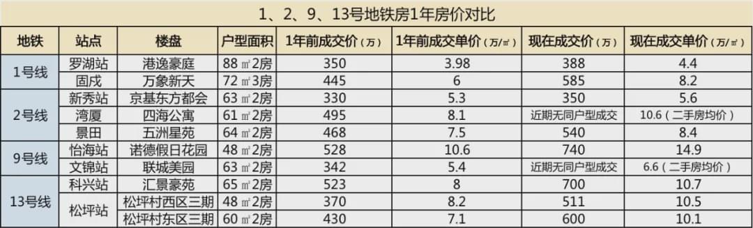 我们追踪的9个地铁盘中,1年时间涨幅较大的5个楼盘,均位于南山、宝安。罗湖、福田则相对温和很多。