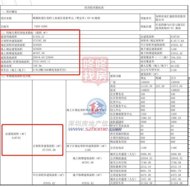 红花岭工业南区03-01地块用地面积41455.21㎡ 总建筑面积418743.00㎡ ,计容积率建筑面积 371703.58㎡;