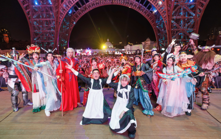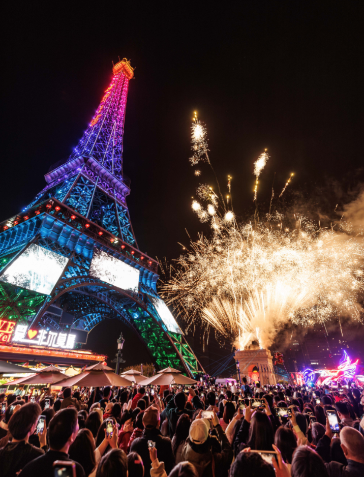 在景区前广场,福龙迎春,醒狮贺岁,让游客感受浓郁的新年韵味。走进世界之窗,财神送福,惊喜连连,哪吒、月老、小龙女、猪八戒、魔法师、花仙子等东西方神话人物的NPC齐聚,与游客欢乐互动,趣味横生的新春快闪,文化底蕴深厚的舞龙舞狮,传统民俗在新年氛围中熠熠生辉……环球舞台五大洲新春万人狂欢大巡游、埃菲尔铁塔下电音狂欢、遍布园区的世界风情演艺、连续九天的凯旋门璀璨绚烂烟花,将世界潮流新风融入东方文化深厚底蕴,满溢在园内的欢声笑语,让新年氛围感顷刻拉满。镜头下开心欢腾的游人、浓墨重彩的喜庆“福”字、古风华服的小姐姐,都为新春佳节增添了一抹亮丽的色彩。一幕幕精彩表演,引得现场游客拍手叫绝。