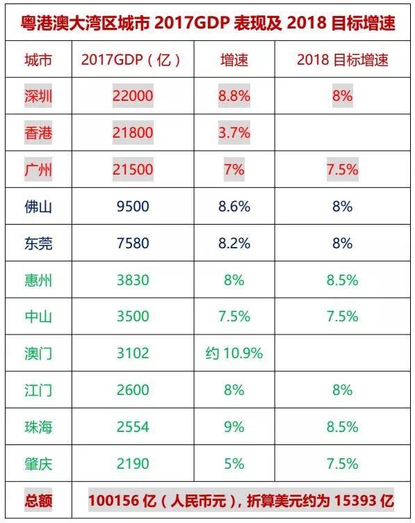 近日,珠三角各个城市陆续发布了2017年GDP预计情况,根据各级政府对2017国民生产总值预计数据的统计,加上香港、澳门两地预估数值,粤港澳大湾区“9+2”城市GDP总额首次突破10万亿人民币!