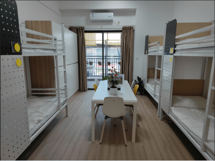 学生宿舍为高配阳台房,卧室供6人居住,配备冷暖空调;卫生间冲凉房有两间,功能齐全;