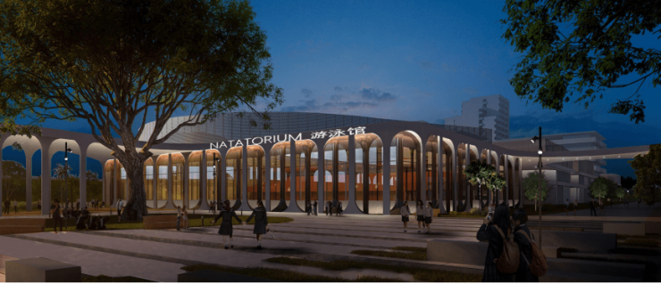 沿中心公共广场铺开,设有演艺中心、综合性体育馆和恒温游泳馆,三校可以充分共享功能。