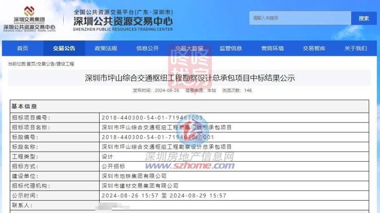 8月26日,深圳公共资源交易中心公示《深圳市坪山综合交通枢纽工程勘察设计总承包项目中标结果》。