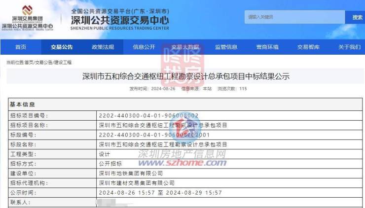 同天,深圳公共资源交易中心公示《深圳市五和综合交通枢纽工程勘察设计总承包项目中标结果》。