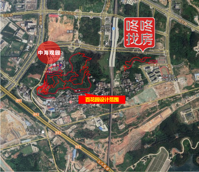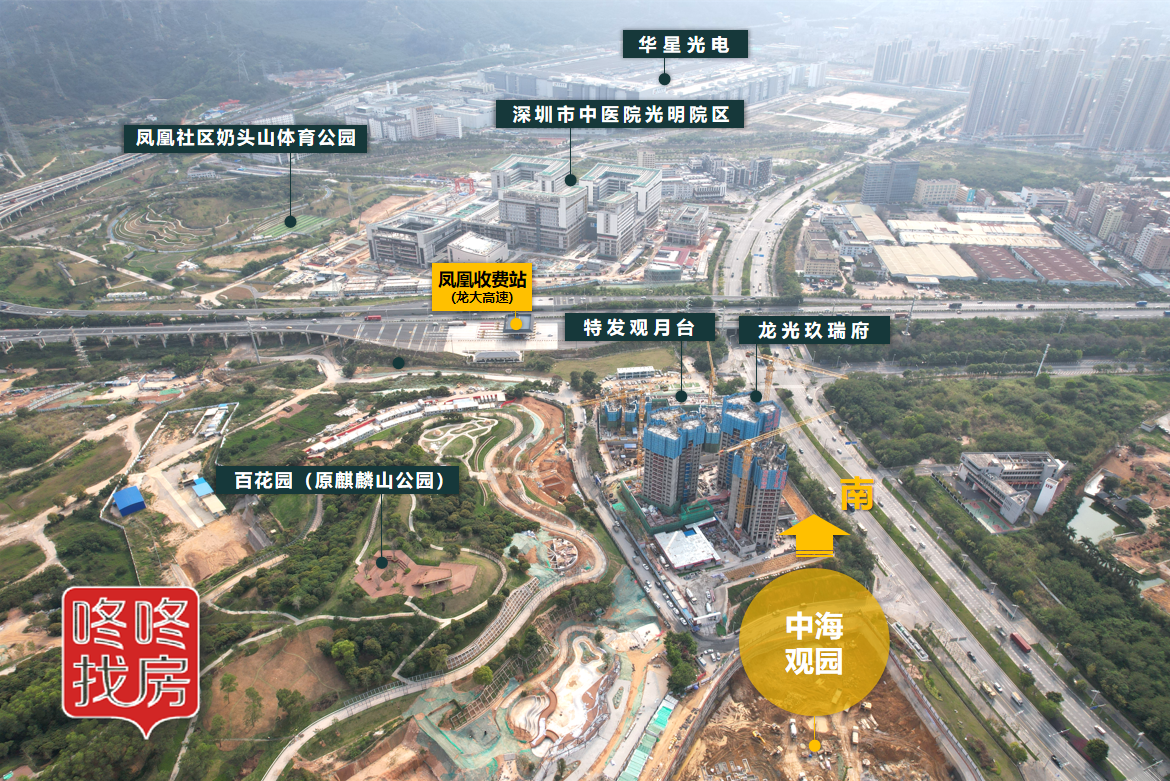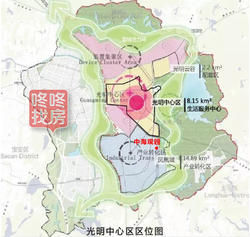 中海观园整体上位于光明凤凰城片区,该片区规划总占地面积约15k㎡,在功能定位上属光明科学城南部产业转化区。片区北上与光明科学城”心脏“——光明中心区形成互动关系。