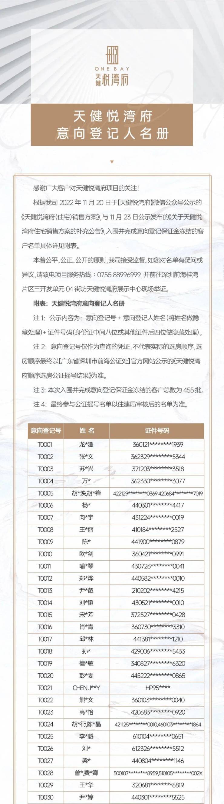 11月27日,前海天健悦湾府发布意向登记人名册,登记455批客户,项目将于11月28日10:00在前海公证处摇号,11月30日正式选房。