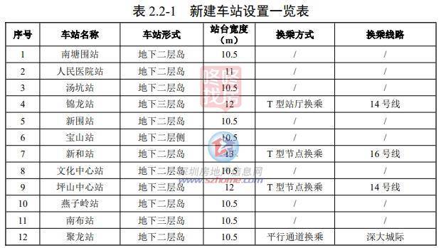 19 号线一期工程位于坪山区,大致东西走向,起于碧岭片区的南塘围站,终至竹坑片区的聚龙站。共设站12座,换乘站4座,均为地下站。车站概况详见下表。