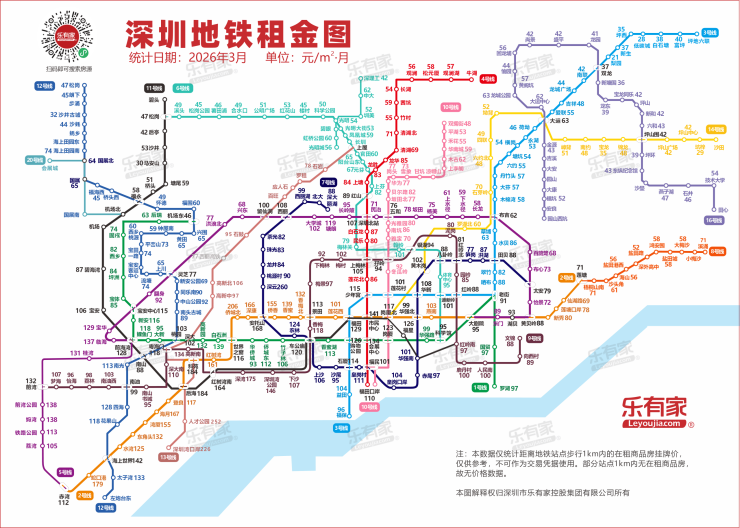 乐有家整理了深圳最新地铁租金图,以地铁站周边1km内商品房小区为统计范围,涵盖16条地铁线343个站点,最低的均租每月仅21元/㎡。