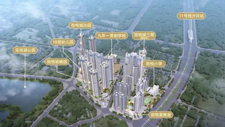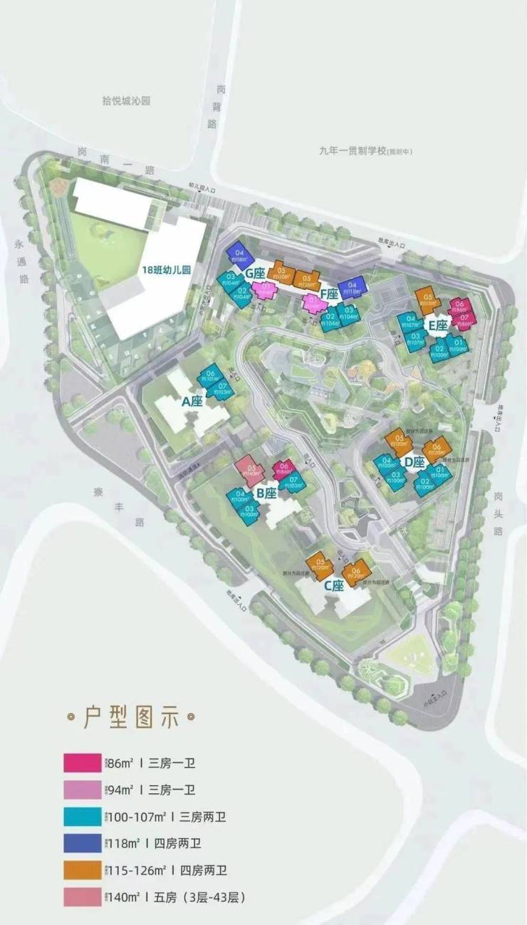 拾悦城整体分3期开发,其中首期已于2017年入市,拾悦城二期占地约3.54万㎡,计容建面约23.5万㎡,自带4500平商业,7栋住宅➕1所幼儿园组建而成,Abc三栋层高53,defg四栋层高48,一路之隔还规划了九年一贯制36班学校、一所18班幼儿园。效果图