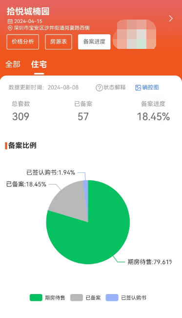 2024年4月,项目推出第二批A、G 座的309套房源,主推约94-120㎡的户型,截至8月8日,去化约不到19%;