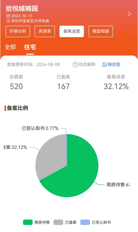 2023年10月,项目推出第一批B、E座的520套房源,主推约86-141㎡户型,截至8月8日,去化约32%;