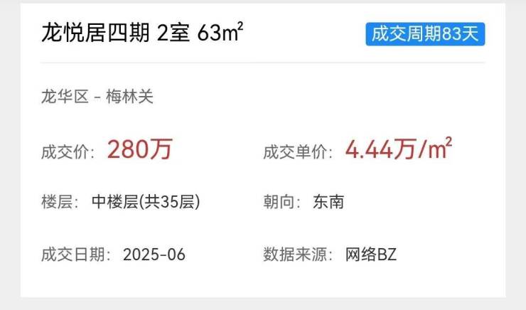 如今在二手房市场,小区的成交价也跌回4字头。6月份成交的一套63㎡户型,单价是4.44万/㎡。