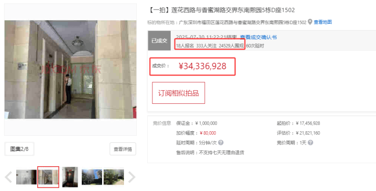 最终,经过82轮竞价后,这套房源成功拍出,成交总价约3434万,溢价率超96%,成交单价高达15.7万/㎡。