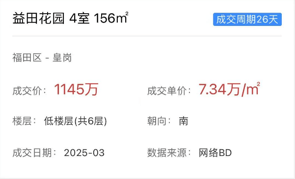 据行舟深房数据,今年3月,益田花园成交一套建面约156㎡的房源,成交总价约1145万,成交单价约7.34万/㎡。