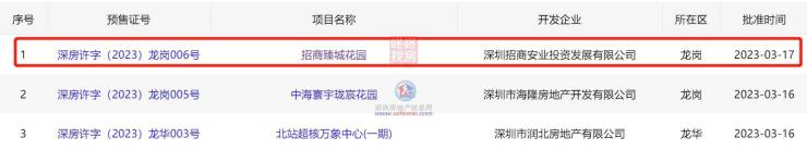 3月17日,位于龙岗的招商臻城花园取得预售许可。