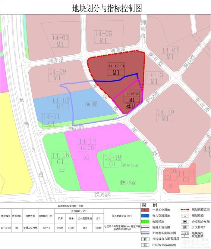 将[大水坑地区]法定图则中14-12地块(一类工业用地)拆分为14-12-01地块(一类工业用地)和14-12-02地块(普通工业用地),调整后14-12-01地块用地面积23997.2平方米,用地功能及容积率保持不变;14-12-02地块用地面积7307.9平方米,用地功能为普通工业用地,规划容积43050平方米,其中厂房30240平方米,宿舍11960平方米,公共配套设施(含地下)850平方米(全部为社区级公共配套用房),另配建社区体育活动场地占地面积500平方米。