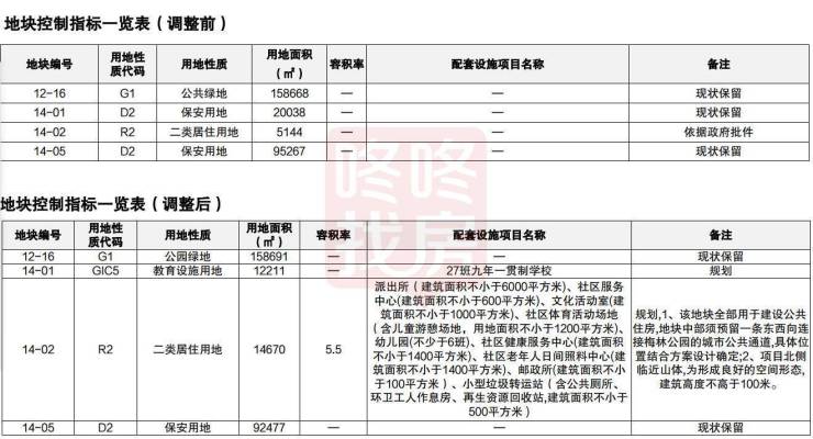 (二)根据调整后的道路线位,优化14-01、14-02、14-05和12-16等地块范围,调整后规划指标为:14-01地块用地面积为12211平方米,用地性质为教育设施用地(GIC5),容积率:-,配套设施项目名称为27班九年一贯制学校,备注:规划;14-02地块用地面积为14670平方米,用地性质为二类居住用地(R2),容积率为5.5,配套设施项目名称:派出所(建筑面积不小于6000平方米)、社区服务中心(建筑面积不小于600平方米)、文化活动室(建筑面积不小于1000平方米)、社区体育活动场地(含儿童游憩场地,用地面积不小于1200平方米)、幼儿园(不少于6班)等。