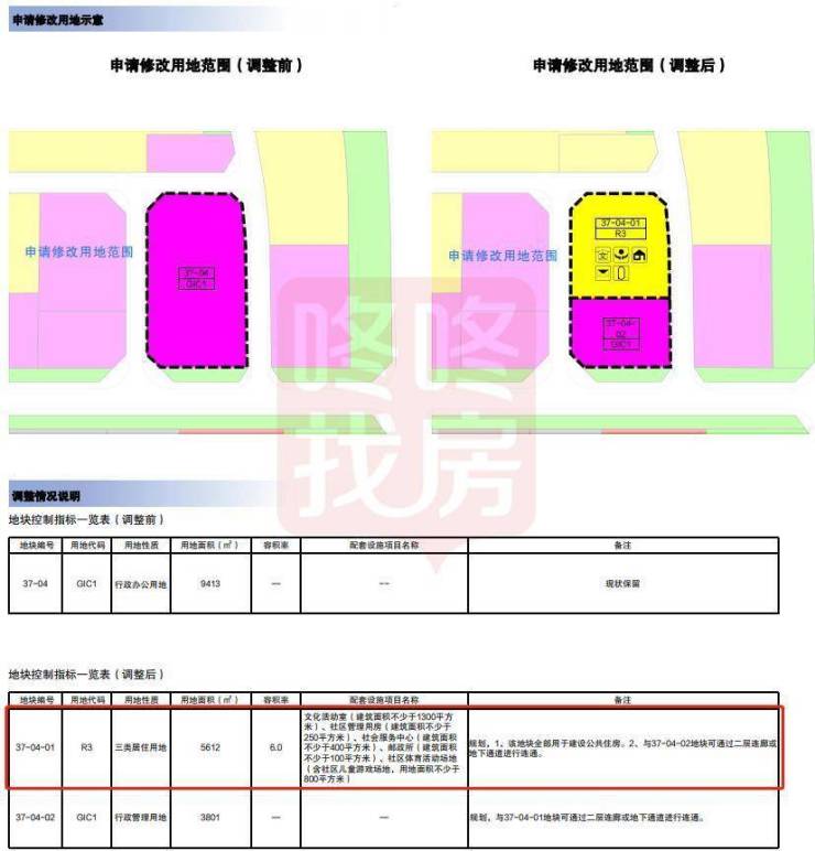 37-04地块分为37-04-01和37-04-02两个地块,37-04-01地块用地面积为5612平方米,用地性质为三类居住用地(R3),容积率6.0,配套设施项目名称为文化活动室(建筑面积不少于1300平方米)、社区管理用房(建筑面积不少于250平方米)、社会服务中心(建筑面积不少于400平方米)、邮政所(建筑面积不少于100平方米)、社区体育活动场地(含社区儿童游戏场地,用地面积不少于800平方米)。