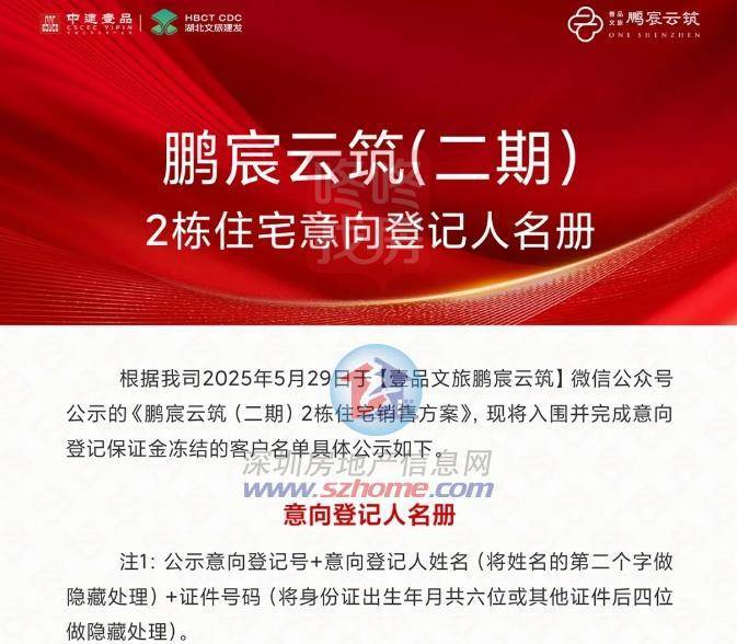 6月4日,位于龙华的鹏宸云筑(二期)2栋住宅意向登记人名册公示,项目此次共有461批客户进行意向登记,项目将于6月5日下午进行选房顺序号摇号,本文将进行直播,敬请刷新查看。