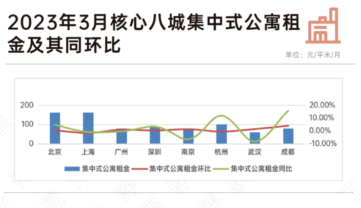 3月,集中式公寓整体租金波动较小,从各城环比涨跌幅来看,除成都上涨近4%以外,其余城市上下浮动1%,上海和北京集中式房源租金仍远高于其他城市。