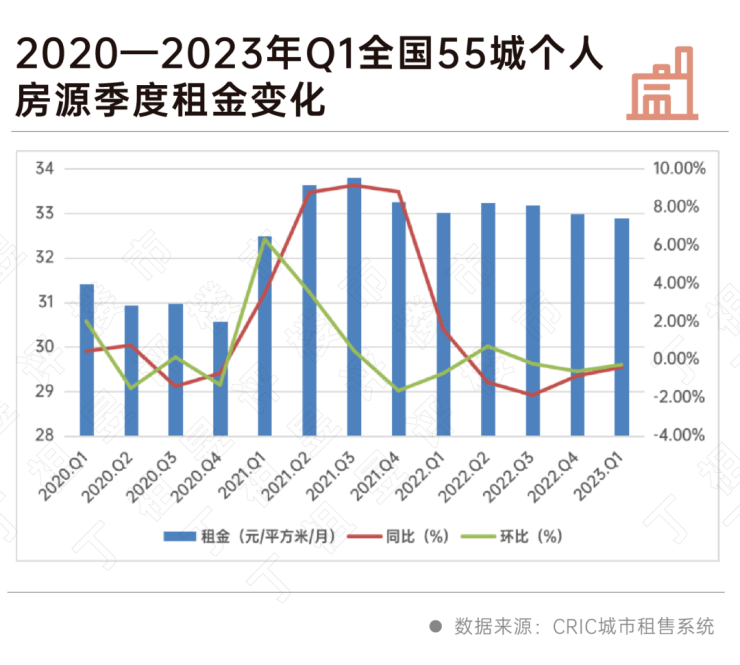 个人租赁房源的表现相对平稳。一季度全国55城个人租赁房源新增房源量150.79万间,新增供应量同比延续下降趋势;平均租金为32.89元/平方米/月,环比下降0.26%,同比下降0.39%,保持平稳状态。