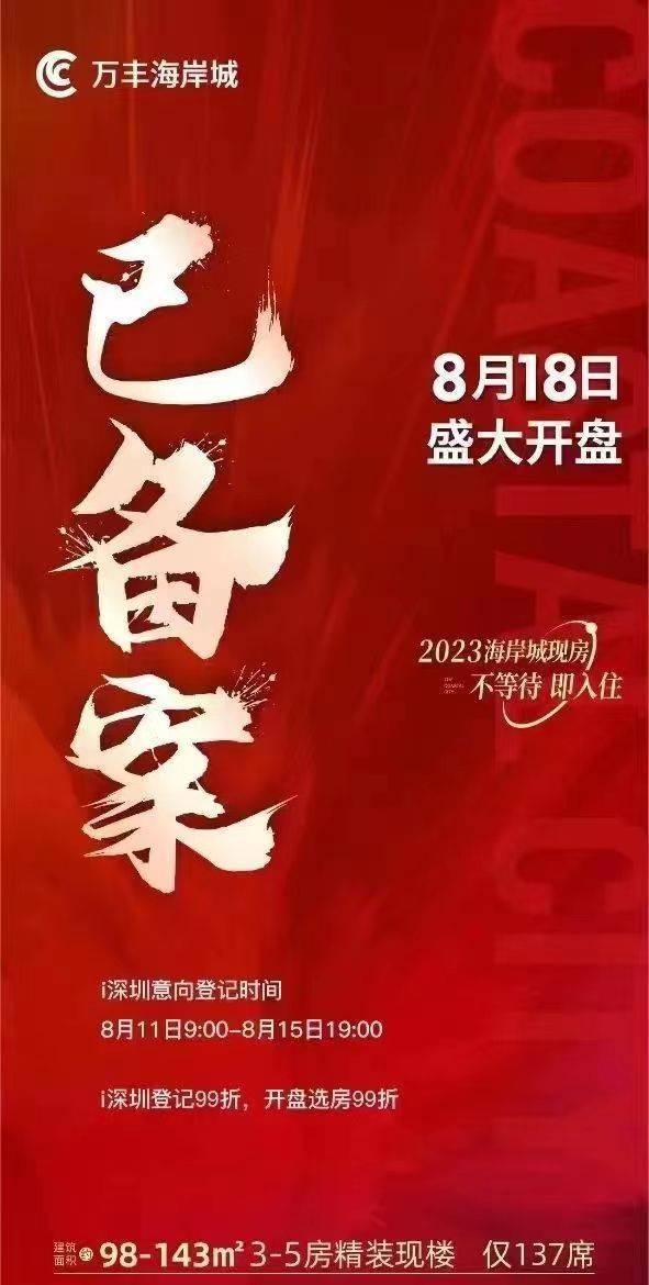 万丰海岸城玺园于当天发布销向登记,8月11-15日i深圳登记认筹,冻资10万,8月16日公布入围名单,8月18日线上选房。