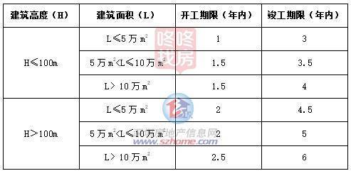 第四条 【开工竣工期限】根据项目用地性质、建筑高度和建筑规模的不同,对划拨和出让用地的开工、竣工期限作如下规定。