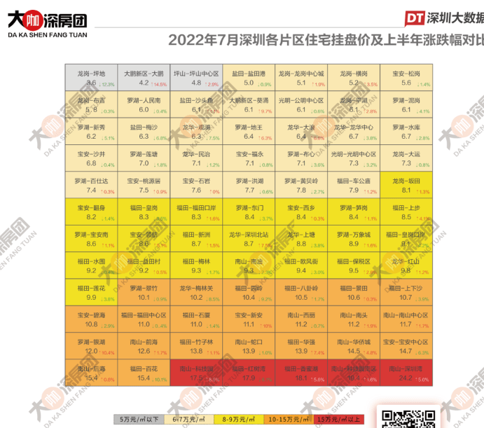 上半年深圳挂盘价对比中,深圳84个片区,共有42个片区挂盘价下滑,41个片区挂盘价上升。