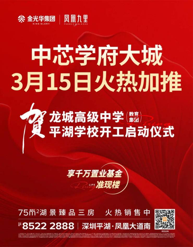 1、本项目推广名为:“金光华凤凰九里”,开发企业为:“深圳大承企业管理有限公司”,预售证号:深房许字(2023)龙岗024号,代理公司为中原地产(深圳)代理有限公司;2、以上文字、图片、宣传信息仅为活动要约邀请,不作为要约或承诺;侵权即删;3、相关宣传内容不排除因政府相关规划、规定及本公司分期规划、未能控制等原因而发生变化;4、本公司可能会不定期对宣传材料进行修改;5、买卖双方的权利义务以双方签订的《商品房买卖合同》及其补充协议、附件等书面文件为准;6、该活动由“深圳大承企业管理有限公司”举办,拥有最终解释权;7、“本宣传资料对学校等教育资源的图片展示、内容仅为规划概念展示,旨在提供相关信息,并不意味着开发商对就学安排作出承诺;8、教育资源的规划方案、功能布置、校园道路、园林绿化景观、地面铺装、外立面展示材质、活动场地等相关展示内容并非实际交付标准,不排除因政府相关规划、规定及开发商分期规划、未能控制等原因而发生变化;教育资源的名称、办学性质、办学规模、学位设置、开学(班)时间、招生条件、收费标准及招生区域存在调整的可能,最终应以相关政府部门、教育主管部门及办学方颁布的政策规定及交付状态为准;9、本资料所发布的内容为2025年3月前的信息,敬请留意最新资料;10、上述湖景指代部分房号可看到湖景,非全项目,不代表交付承诺;11、千万置业基金是指2025年3月现场推出的相关优惠政策,每套房具体享受的优惠金额以现场实际情况为准;12、准现楼是指楼盘主体结构已经完工,且购房人可以看到楼房的大致轮廓;13、龙城高级中学(教育集团)平湖学校规划名为凤安九年一贯制学校;14、龙城高级中学(教育集团)平湖学校开工启动仪式的信息来源于平湖街道2025年重点项目开工启动仪式。