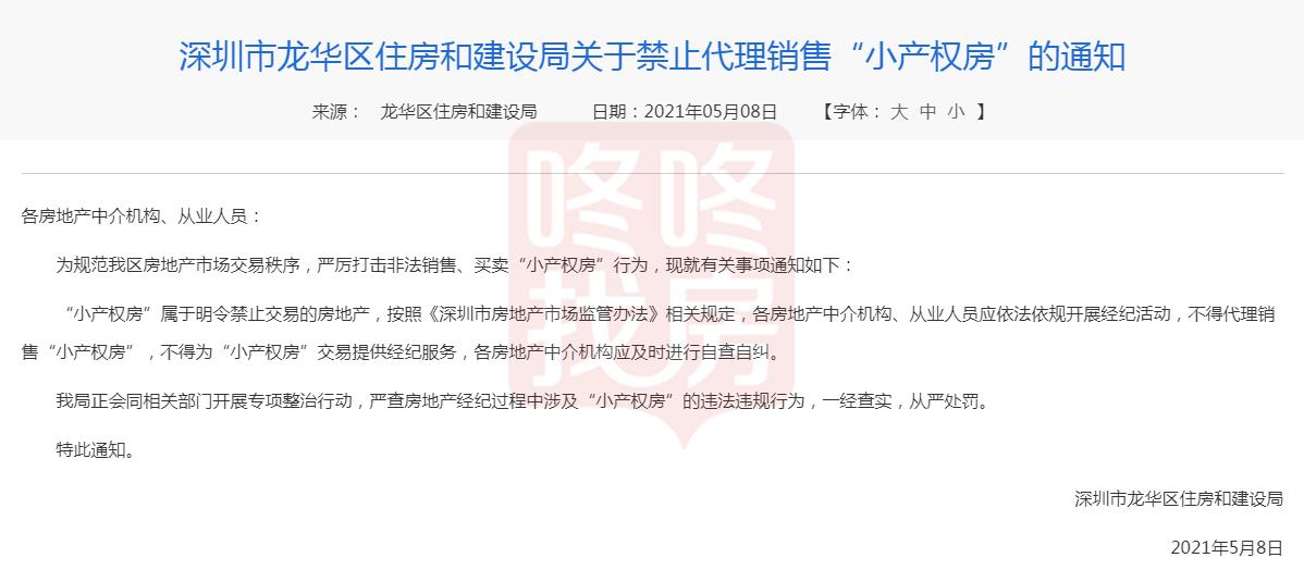 事件:5月8日,深圳市龙华区住建局发布《关于禁止代理销售“小产权房”的通知》。