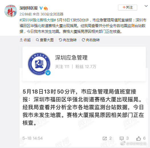 据深圳应急管理通报,5月18日13时50分许,深圳市应急管理局值班室接报:深圳市福田区华强北街道赛格大厦出现摇晃。经我局查看并分析全市各地震监测台站数据,今日我市未发生地震。赛格大厦摇晃原因相关部门正在核查。