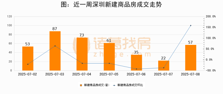 根据深圳市住房和城乡建设局数据显示,2025年07月08日深圳新建商品房成交57套,较昨日增加35套,环比上涨159.1%