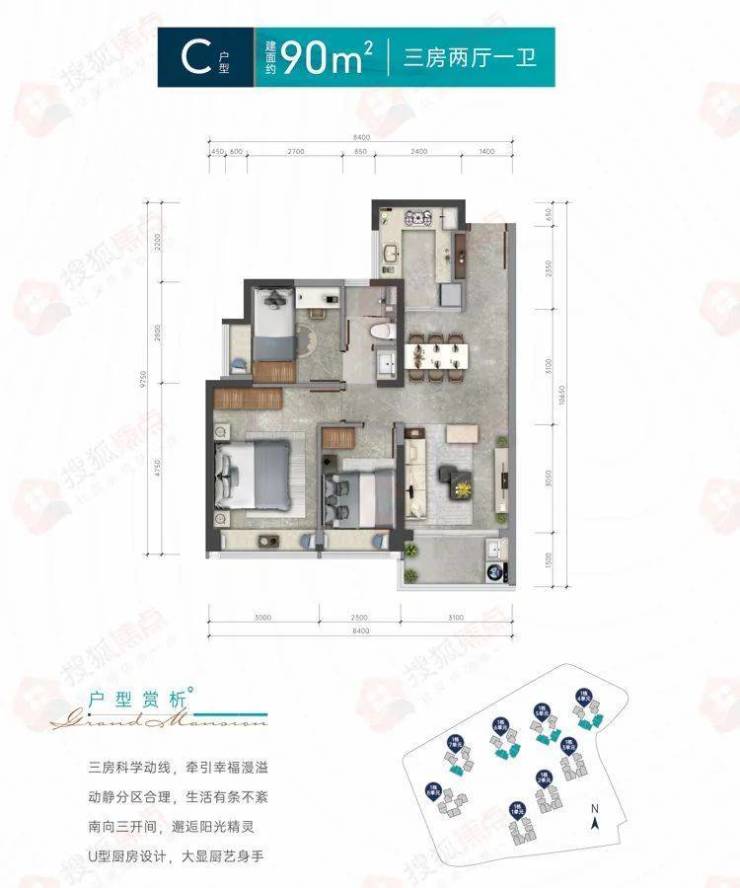 目前户型图已经公示,项目一共有11个户型,A、B、C为主力户型,其中A、C户型为90㎡3房,B户型为2房,项目大部分房源为东南向或西南向,前观海,后靠山,景观资源十分丰富。