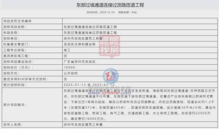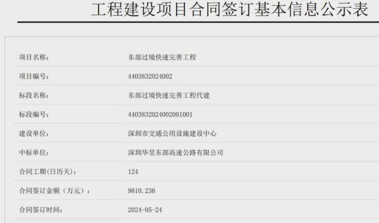 另外,在2024年12月,深圳公共资源交易中心公布过东部过境通道连接过沥路匝道工程施工的招标计划,总投资额2.2亿元。