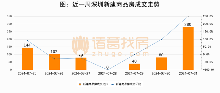 根据深圳市住房和城乡建设局数据显示,2024年07月31日深圳新建商品房成交280套,较昨日增加200套,环比上涨250%