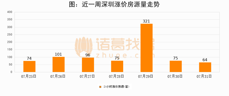 根据诸葛找房数据显示,深圳24小时涨价房源量为64套,较07月30日减少11套,环比下降14.7%。与此同时,涨价房源占比小幅回落,对于购房者来说是一个入市窗口期,购房者可抓住时机入市。
