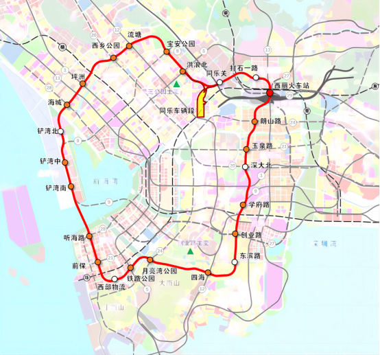 15号线位于深圳市南山前海中心,是串联前海、南山和宝安中心区的普速环线,线路全长32.2km,设站24座,其中换乘站18座,平均站间距1.34km,均为地下敷设。