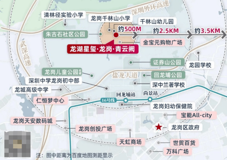项目地处龙岗中心城龙岗街道,跟龙岗区政府直线距离约3.5公里,直接锚定中心。附近就是万科清林径、国香尚居、承翰陶源花园等多个已交付的小区,片区生活氛围浓厚;直线约500米的散步圈内,学校、商场、公园都有了。