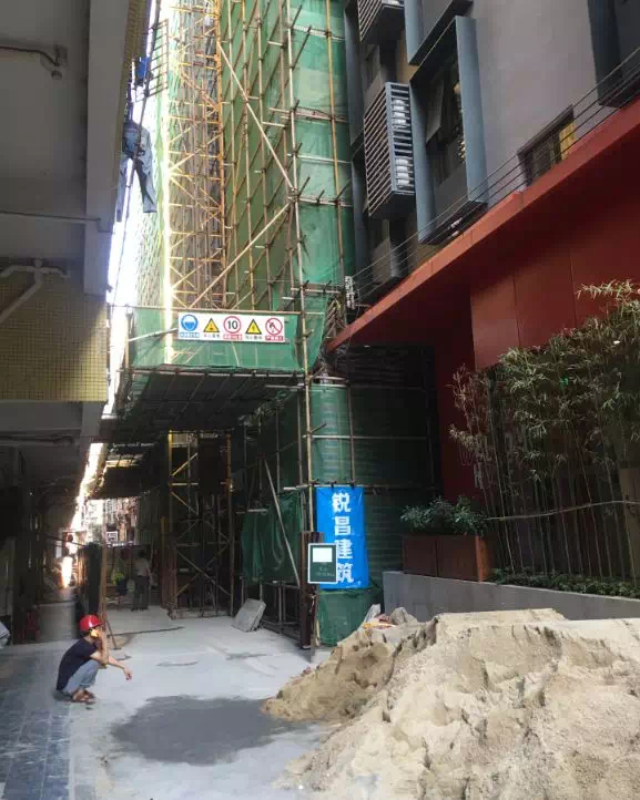 另外,在改造完成的2栋楼边上,我们看到有些农民房也装上了绿网,有装修工人在做拆除的工作。